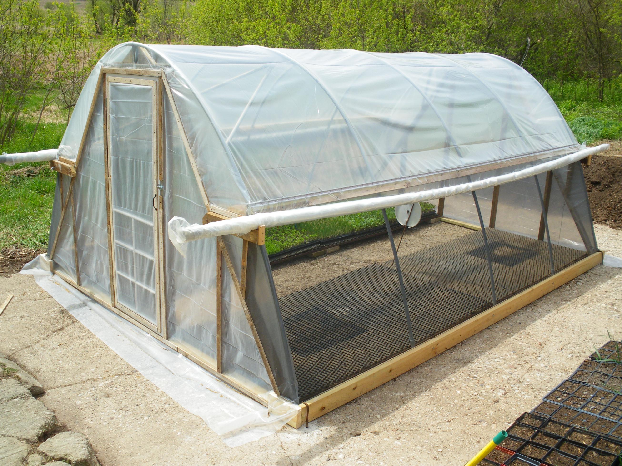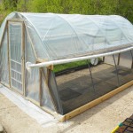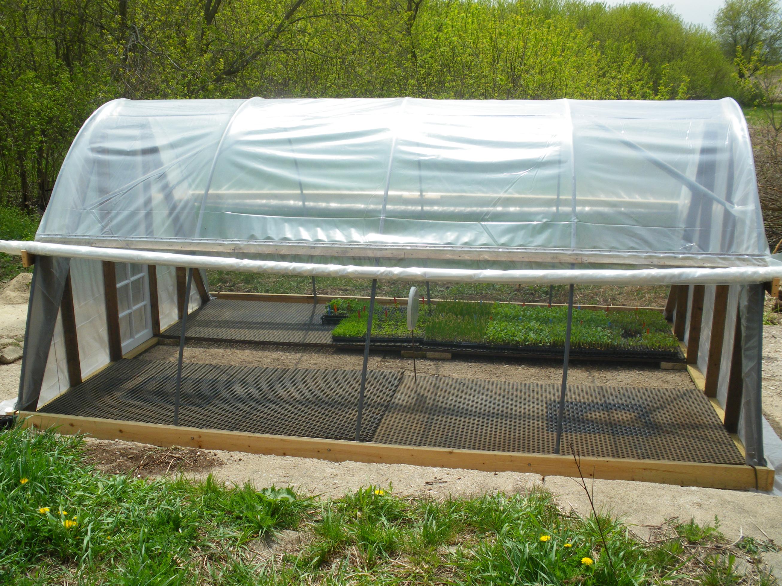 Our ‘new’ hoophouse is not extremely large, (12′ x 16′) but it is big enough for us for the next couple years. We plan on using it for overflow space from the greenhouse as well as a place for hardening off plants before they go out into the garden. It was put together from pieces of our neighbor Mary’s old greenhouse as well as some conduit and an old screen door we had laying around in the barn. We really make an attempt to re-use as many things as we can both to help the planet, and to reduce our expenses.