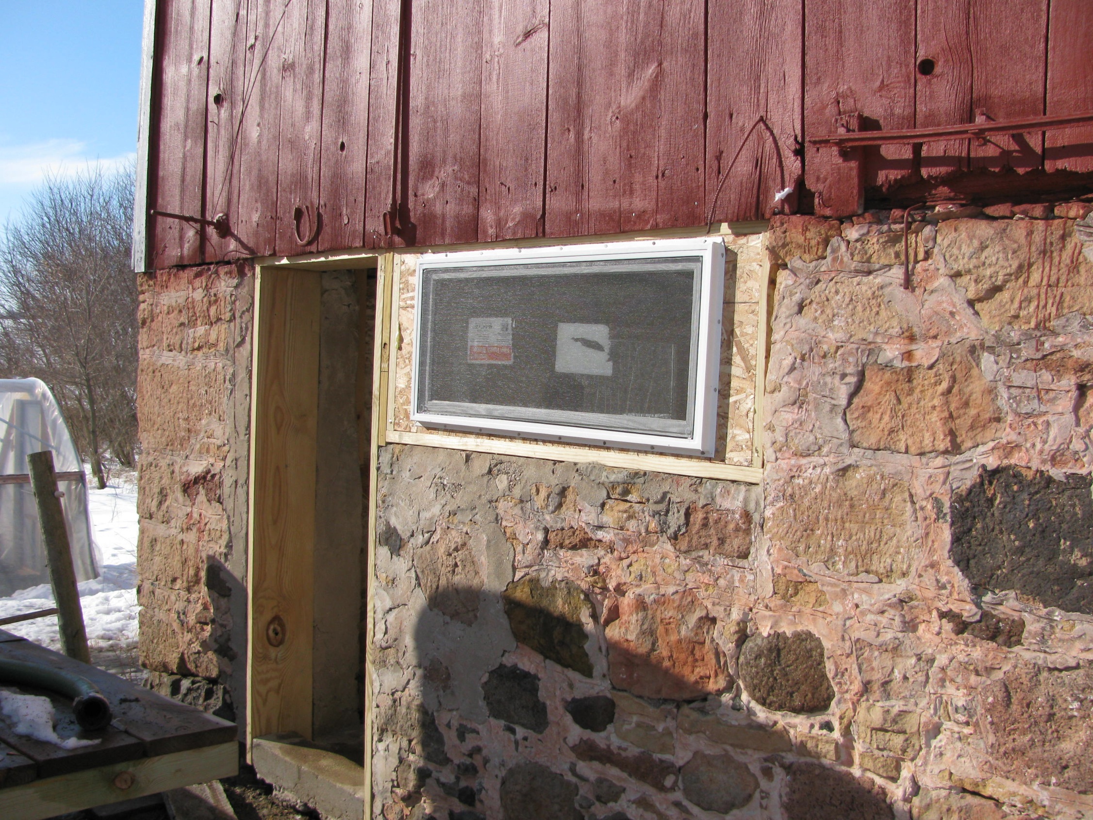 The room is now totally enclosed. We put the exterior door in and the east window in place. The room is already a lot warmer now that there aren’t any drafts. It is pretty tricky putting doors and windows in openings that are not square or level, but Tyler managed and they look really nice.