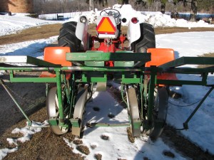 Last Thursday we went to Stoughton and bought a two row tobacco planter. Don’t worry, we will not be using it to plant tobacco! The set up is perfect for planting vegetable plugs. Last year we planted everything we started in the greenhouse with a one row planter. Since we are expanding this year and a two row planter allows for more even spacing between rows, we decided to upgrade to the two row planter. This means that we can have four people riding on the planter at one time to feed the fingers that place the plugs in the ground. I am excited to use this new planter. The previous owner attached bars to increase the storage space so we can carry more flats with us out into the field, which means less time driving back to the greenhouse to pick up plants.