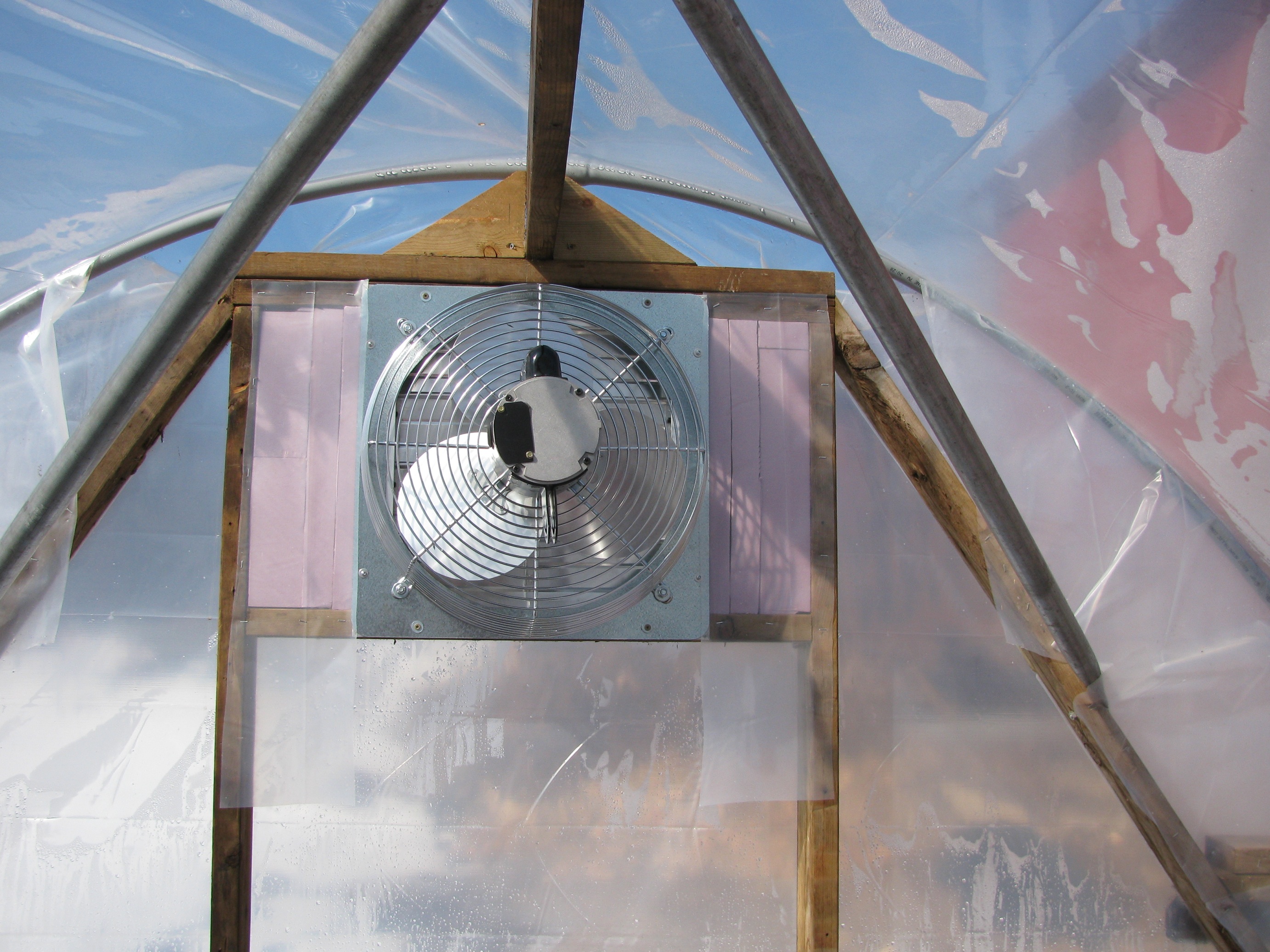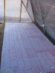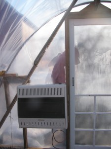 Monday we spent the day turning the hoophouse into a greenhouse. We added a heater and an exhaust fan. Tyler is working on wiring the house so that we can plug our new germination flat in.
