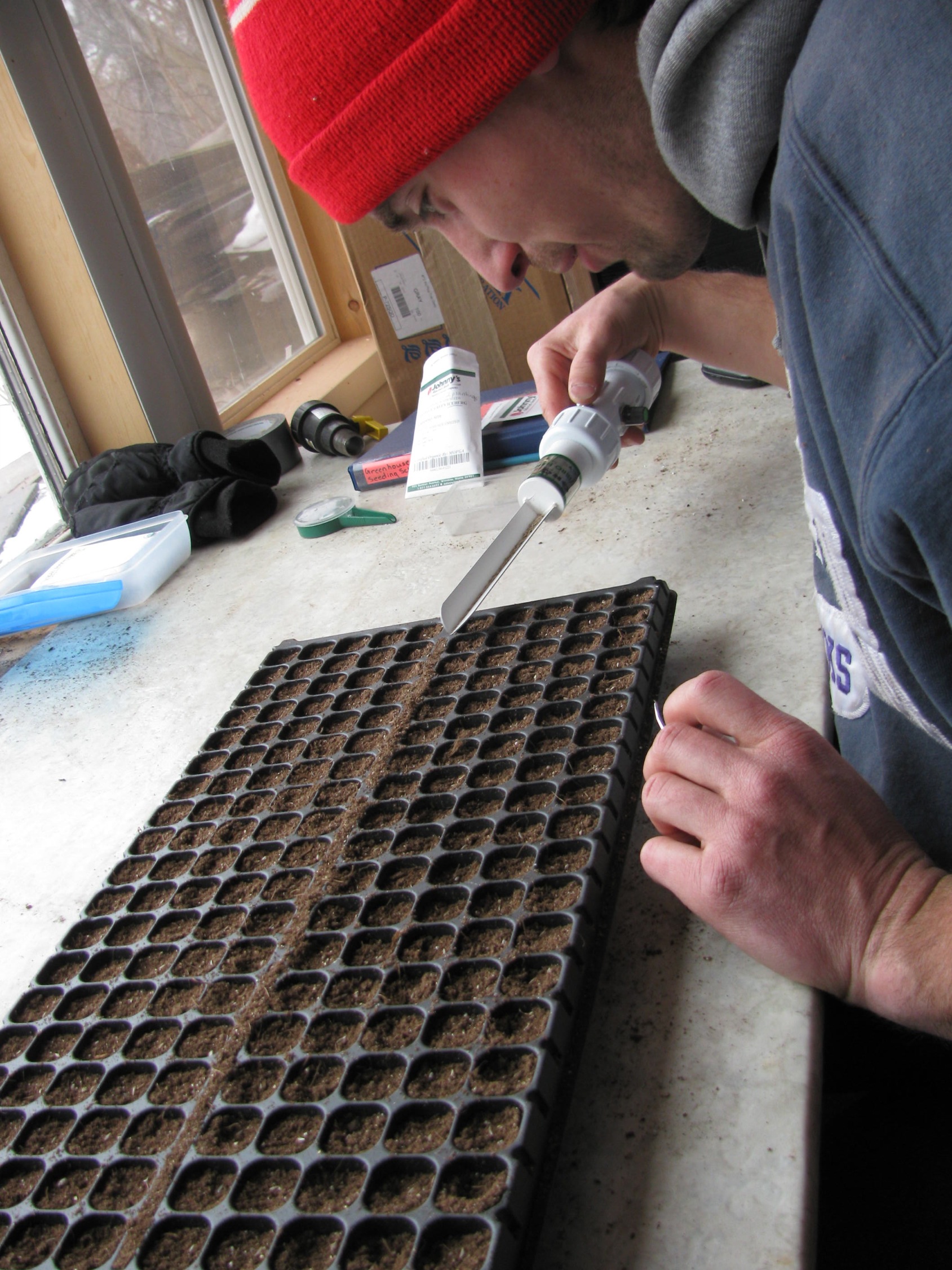 The celery has started popping in the greenhouse. This week we seeded collards, Brussels sprouts, kohlrabi, more scallions, and iceberg lettuce. Our vacuum seeder worked really well with the collard and kohlrabi seed. For the lettuce seed we used our new vibro seeder. That worked so much better than how we have seeded lettuce in the past. The vibro seeder separated the flat seed much more easily than some of the other methods that we have tried. The Brussels sprout seed is probably the most expensive seed that we purchase, so for that crop we seed each cell individually by hand. We want to reduce the number of doubles as much as possible so the seedlings don’t have to compete for nutrients.