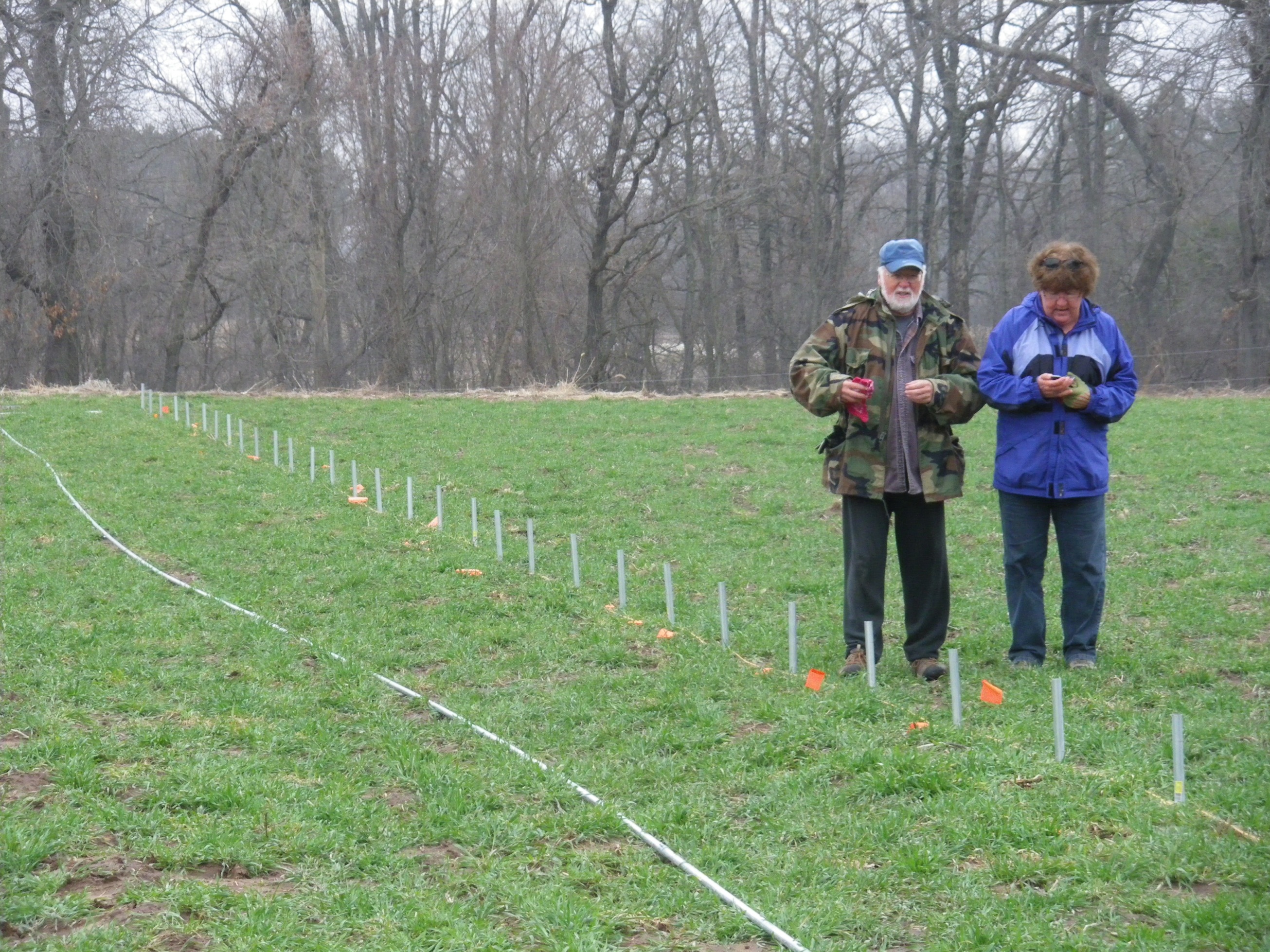 The first step in our high tunnel building adventure was to measure and square off the section where we wanted to put the high tunnel. Then every four feet a ground post was driven. The ground posts were three foot sections of 1-inch conduit pounded two feet into the ground. Once that process was done, we laid out the conduit that will be used as the purlin to keep the hoops stable.