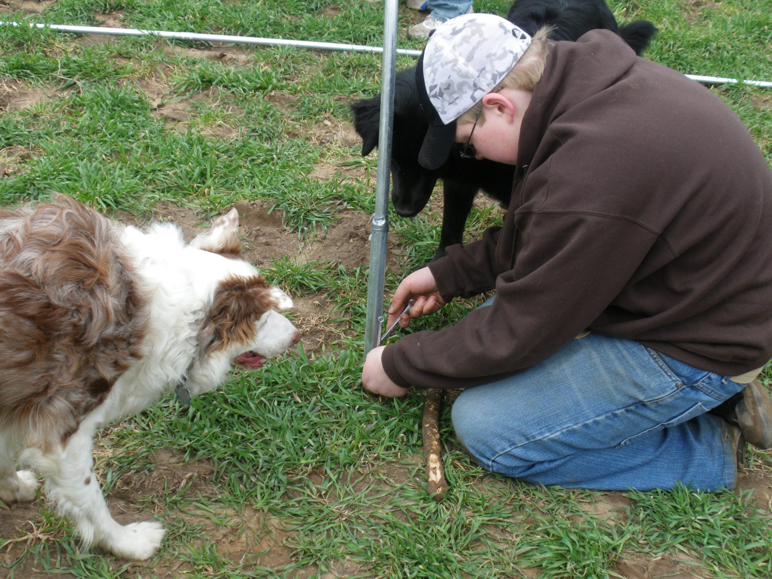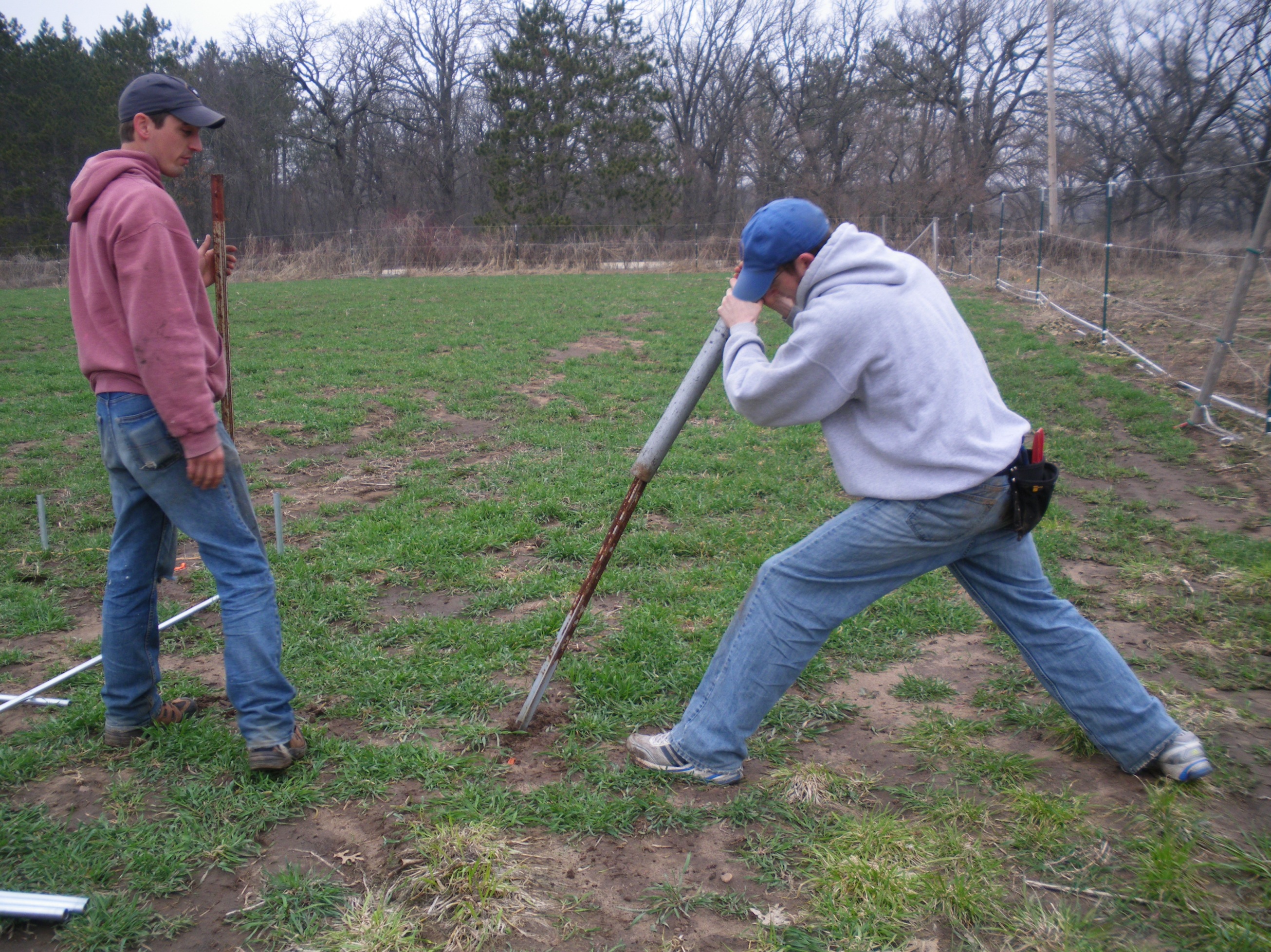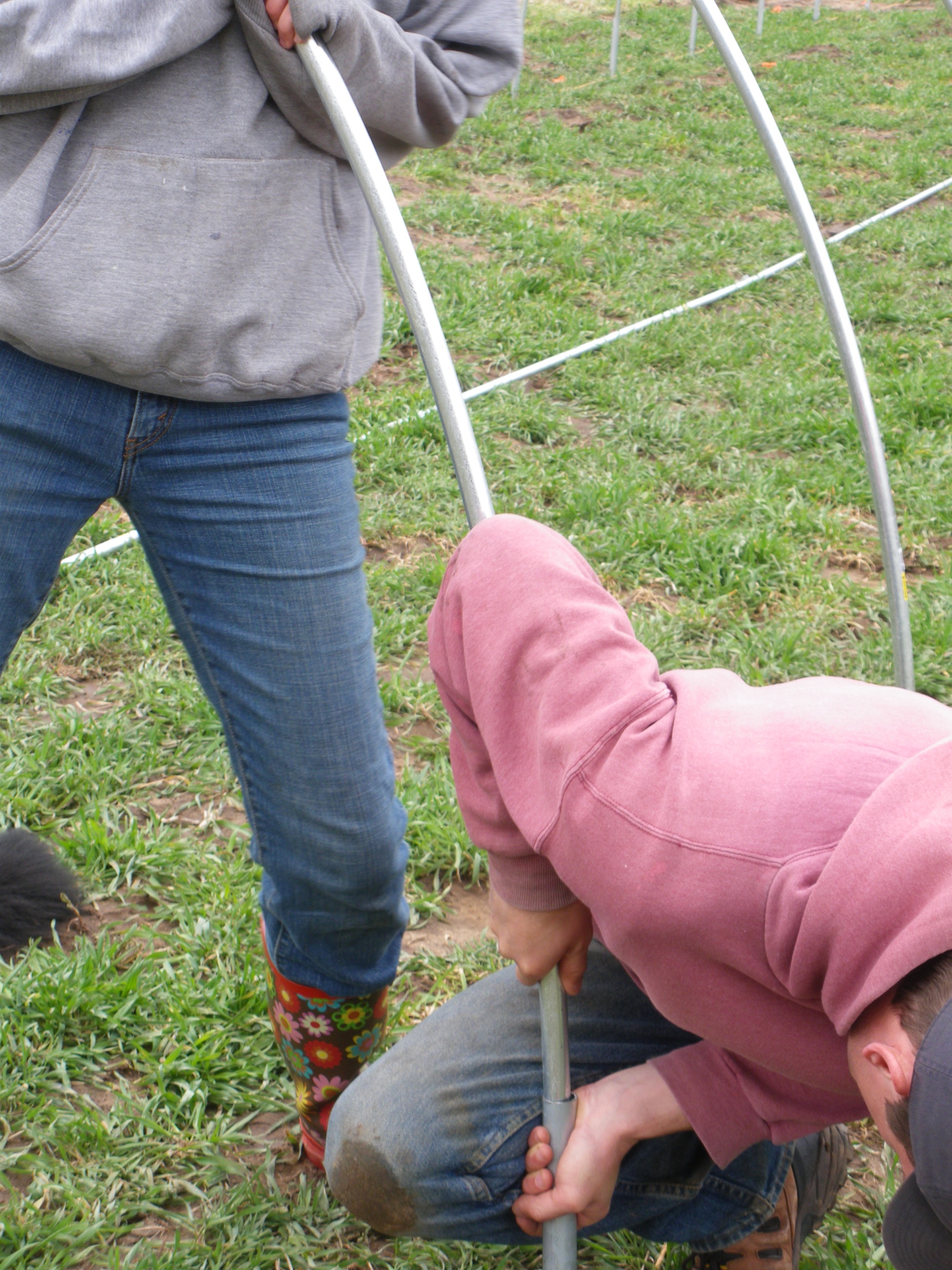 At this point all of the hoops were in the ground, but they were not connected securely to the ground posts. To make sure we had a solid connection the hoops had to be first pushed or pulled to the right height. Sometimes this was fairly difficult to do because of the tension on the pipe.