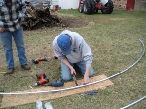 Meanwhile, our workers were busy bending the hoops. Two ten foot lengths of 3/4-in conduit were bent to form the hoops. In order to make a twenty foot arch, two sections of conduit had to be joined together. Since we used unswaged conduit, we had to come up with a way to connect the pipe. We ended up cutting a ten inch section of 1-inch conduit to act as a joining sleeve. This worked much better than the set screw couplers we originally planed on using.