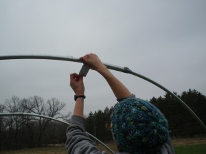 Since we were so tired by the end of the day, we ended up ziptying the purlin in place. Once the weather lets us back out into the field we will attach the purlin more securely to the hoops and put the poly up so we can start growing our lovely lettuce.