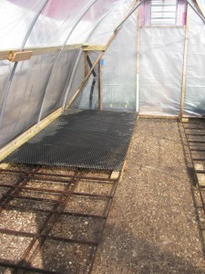 Don and Irv finished transferring the pressure washer onto a rolling cart early this afternoon. Now that it is mobile, we can move it around the farm to project sites. We were finally able to pressure wash the bench tops for the hoophouse extension and get them installed. Tyler bleached them with the spray pump and we are waiting for them to dry.