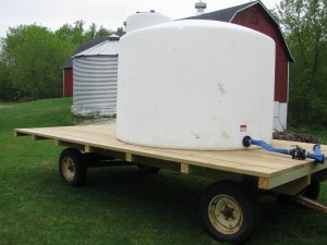 On Tuesday Tyler and I went to Dalton to pick up a running gear that had a new platform built on it. It pulled surprisingly well behind our little green truck. When we got home Tyler, Don, and I lifted one of the empty bulk tanks up onto the platform. We are going to need to install some blocks to keep the tank in place, but it looks like it will work perfectly to haul water into the other field. The platform looks so nice that we are planning on using it for a wagon on farm tours when we have events here at the farm.