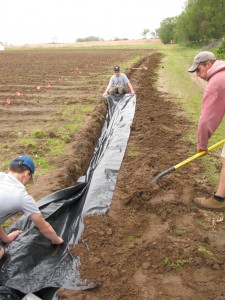 We are trying a new method of control for Colorado Potato Beetles this year. We are digging trenches and lining them with black plastic. When the beetles move from their overwintering site in the brushy fence row a lot of them walk and this way they fall into the trench as they try to reach the potato plants. The plastic prevents them from climbing out and they die in the trenches. It is a lot of work and so far we have the west side done. We need to at least get the south side finished as well this spring, since those are the areas where the majority of the beetles will be coming from. We want to make sure we get the whole field encircled by late summer to trap the beetles as they move to the fence rows to overwinter. By decreasing the overwintering population that should help us out next year.