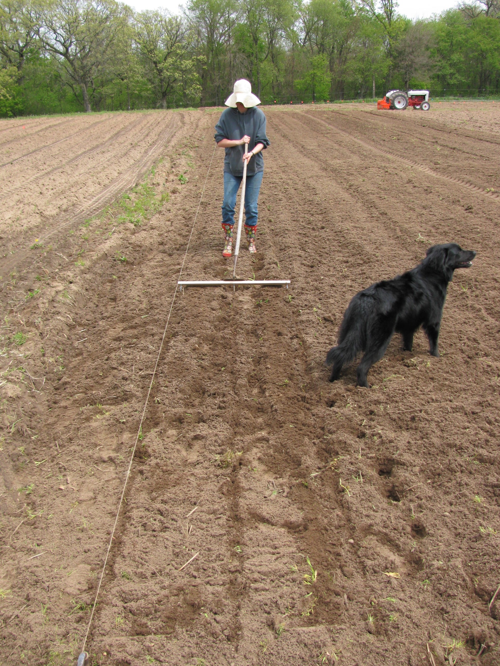 Early in the week we were able to get a lot of seeds in the ground. We created a new tool to help mark where the rows are for things that are direct seeded. We are now able to set up one string that marks a straight row and then pull our marker along the string to make three parallel lines that are 17 inches apart. We used this new tool to mark the rows to plant beets, arugula, Swiss chard, pac choy, and turnips. Between our 3 pt rototiller and our new tool, we have cut the amount of time it takes us to get our direct seeding by almost two thirds.