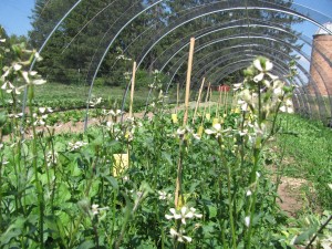 It will probably be the last week for arugula and bok choy until the fall. All of the 90˚+ days that we have been having have triggered the flowering process in both of those species. Once the plants start to flower the leaves turn bitter. This year we are going to make sure we till the arugula under. Last year we let it go to seed and this year we have volunteer plants everywhere. They have actually become a weed in some areas.