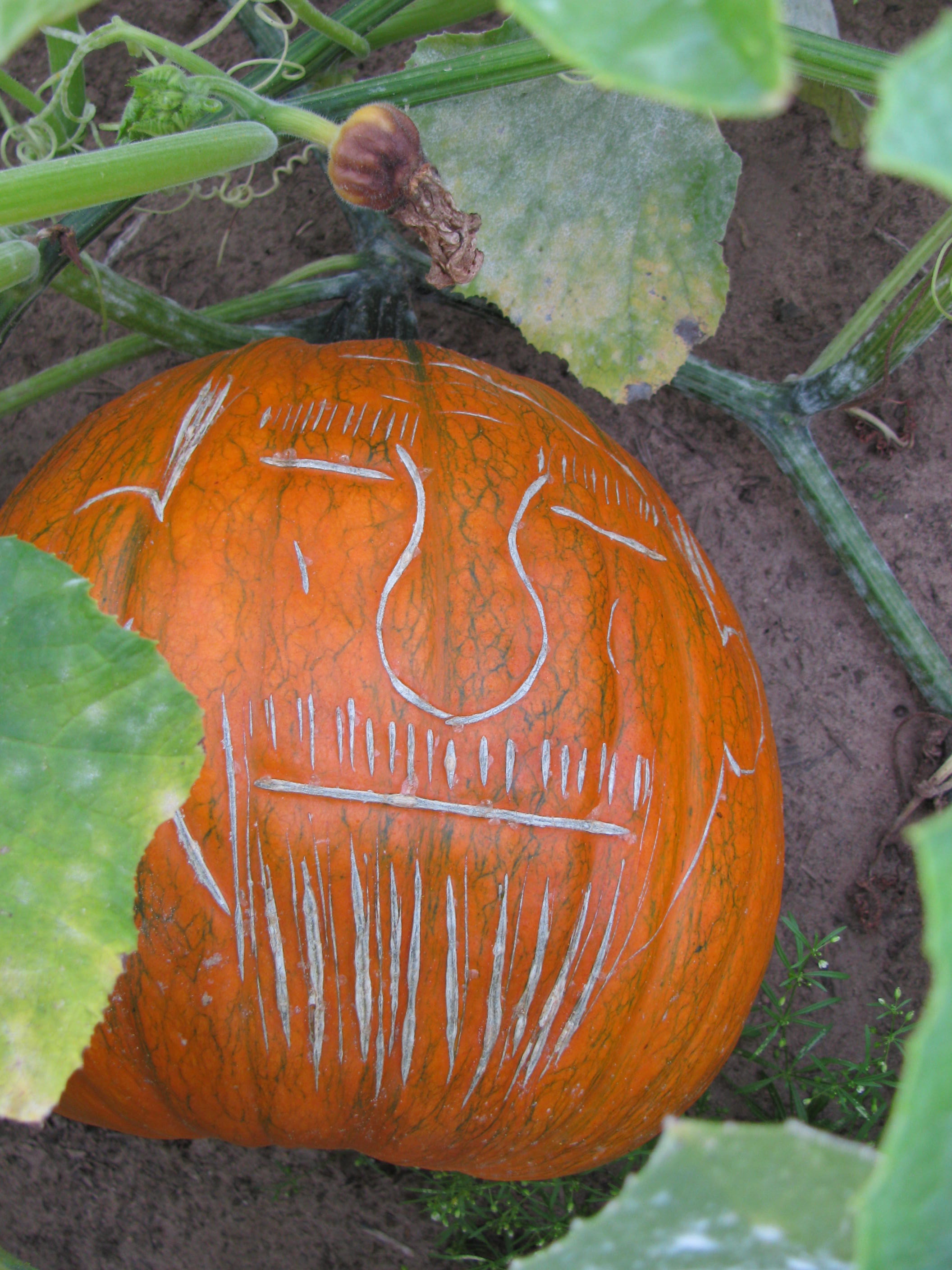 The pumpkin in this photo was carved by Tyler when it was still green. As the pumpkin matures and turns orange the carved area becomes pale due to scar tissue. We have carved peoples names and faces into several of the pumpkins. Lines are super easy to make, curves are difficult. We think they look pretty cool.