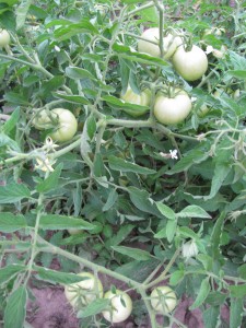 If the weather holds for the next couple months, we should have an excellent crop of tomatoes. This week the first couple of tomatoes per plant are starting to turn red. Pretty soon we should have a bumper crop. The plants look like they are producing a lot more fruit per plant than last year. We have noticed some cracking near where the fruit attaches to the stem. Some causes of cracking are rapid growth due to hot temperatures, too much rain or irrigation, low potassium levels, or removing too many leaves and exposing the fruit to high light levels.