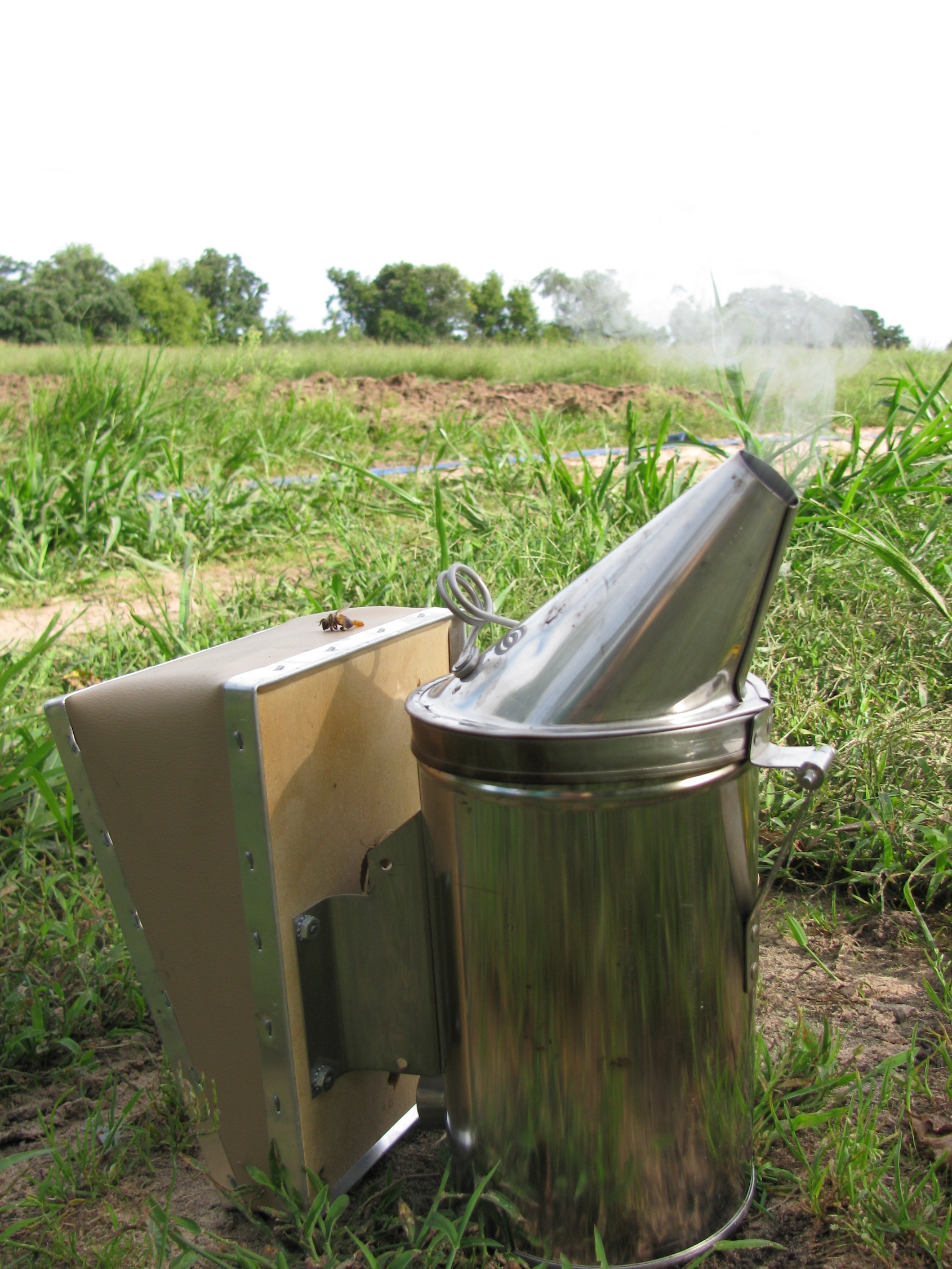 But the other awesome thing about bees is the honey! We harvested the first of our honey last week with the help of Susan Jentz, a CSA member and bee enthusiast. We started harvesting the honey around 4 pm on Wednesday. Since we were disturbing the bees to such an extreme, Susan used a smoker to calm the bees down. The brown contraption on the left of this photo is a bellows to keep the fire smoldering and keep up smoke production. It worked fairly well and Susan only got stung once that night.