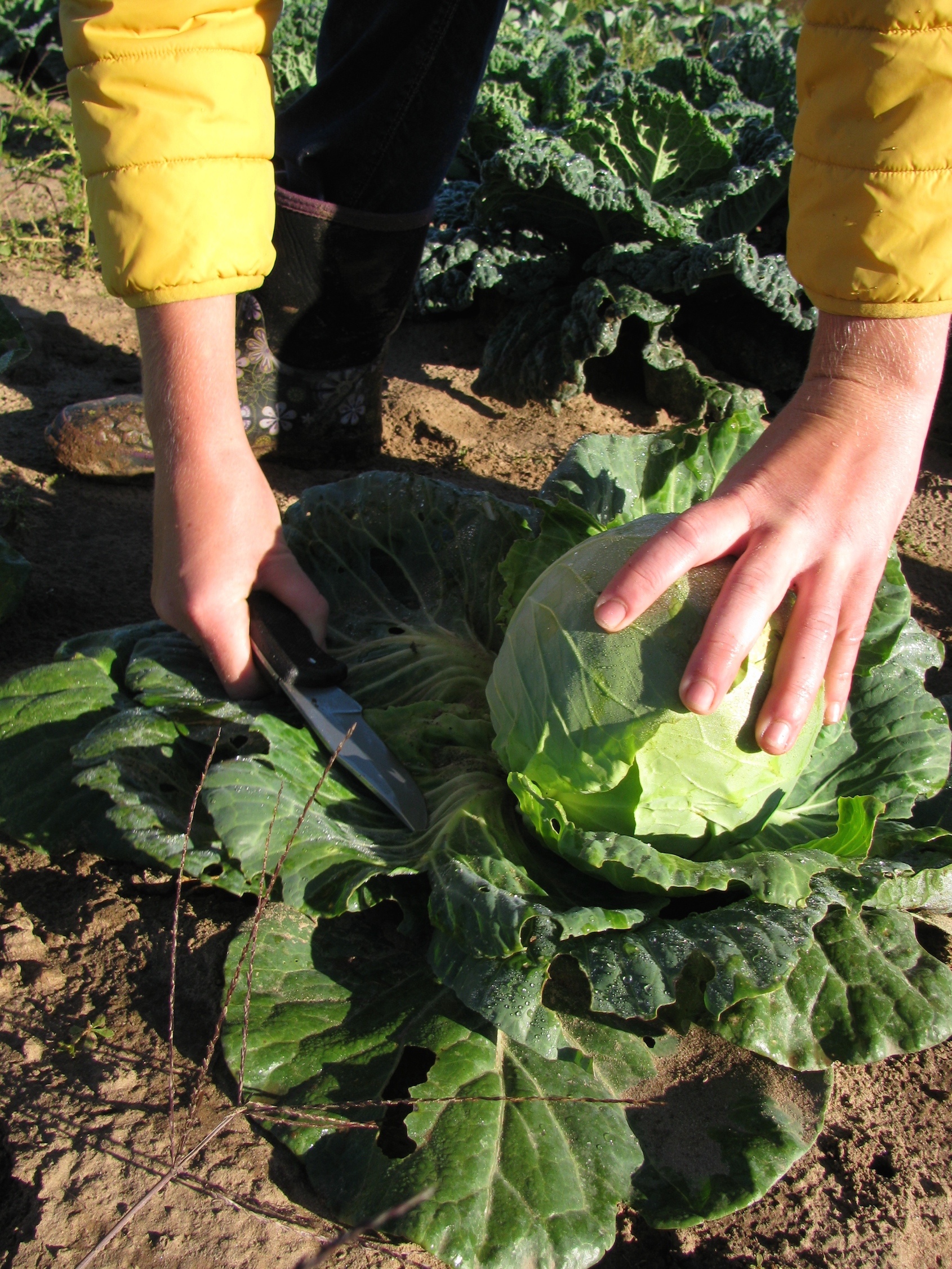 I promised some time ago to give a description of how our harvest/packing days work since many of you will never have the opportunity to come out and see the process in person (although if you are interested we always love the help!) I thought I would follow this weeks cabbage plants from the field to your box. Many of our crops are harvested the day they get delivered. The exceptions being crops that are ready early in the season that store well (garlic, onions, dried beans, winter squashes) and crops that are very time consuming to pick (green beans). Sometimes we might harvest a crop the day before if the weather is going to be really wet and we don’t want to spread disease (tomatoes), but for the most part we do everything the day of delivery.