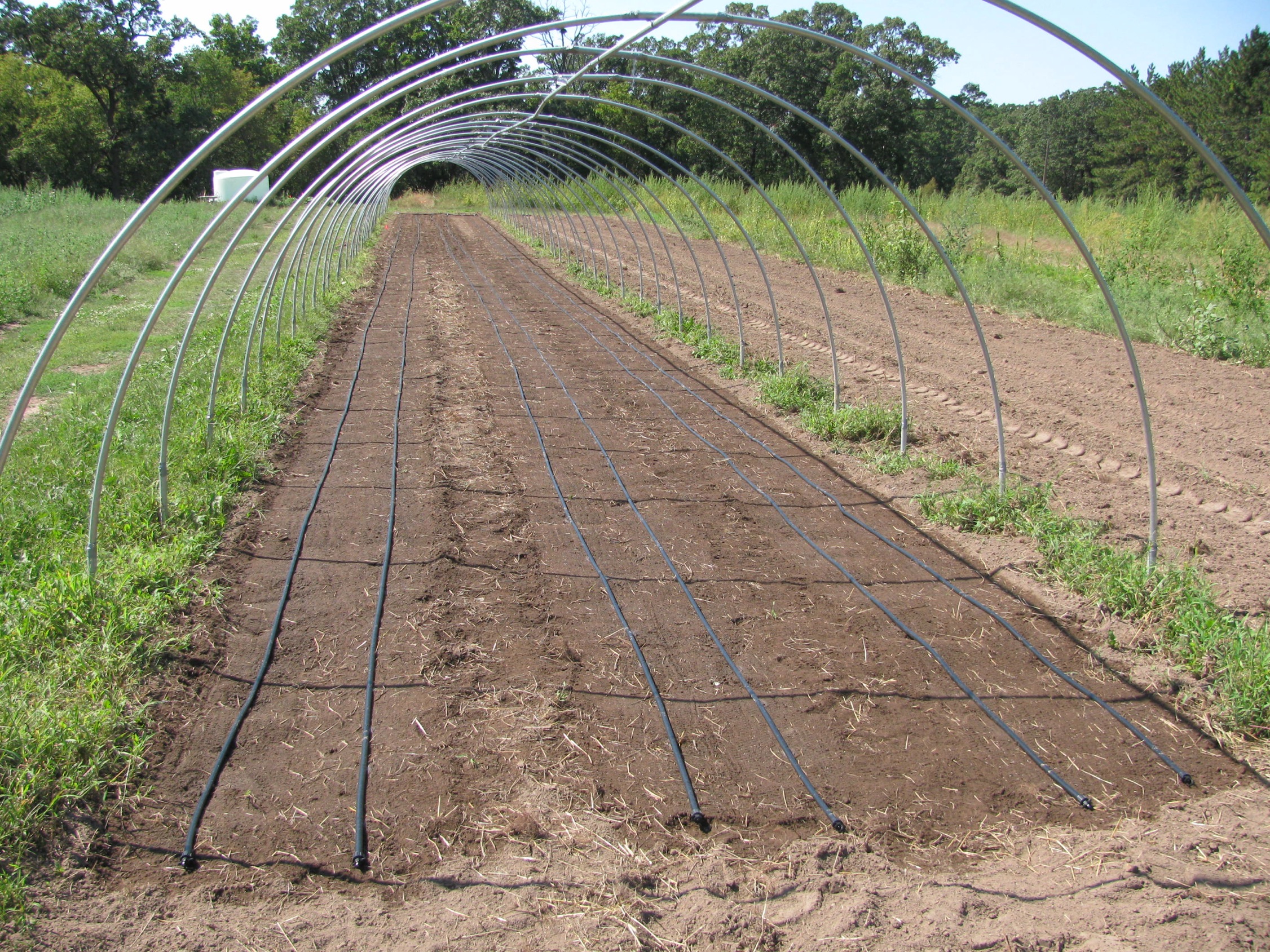 After we seeded the area under the high tunnel we laid drip tape and turned that on right away. A nice, gentle soaking should help boost germination rates. We did get some rain last night, too, so that should help.